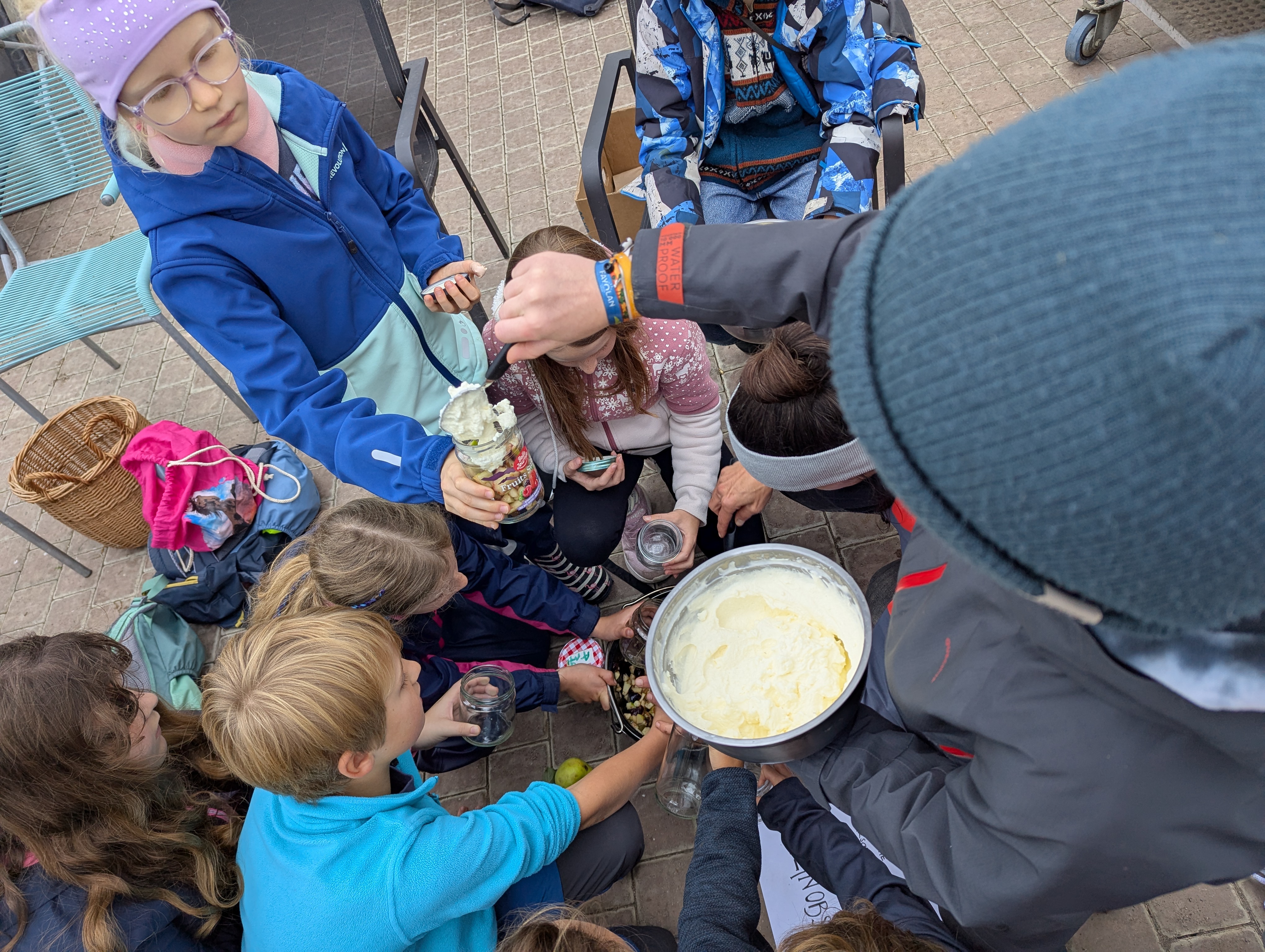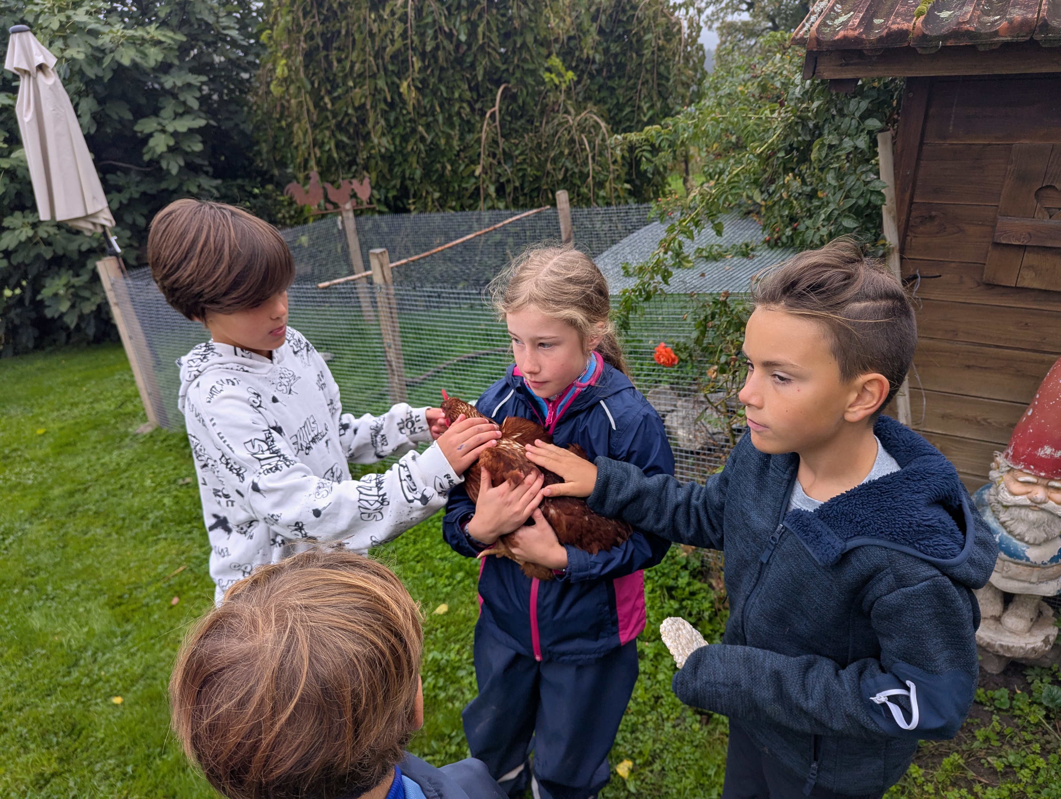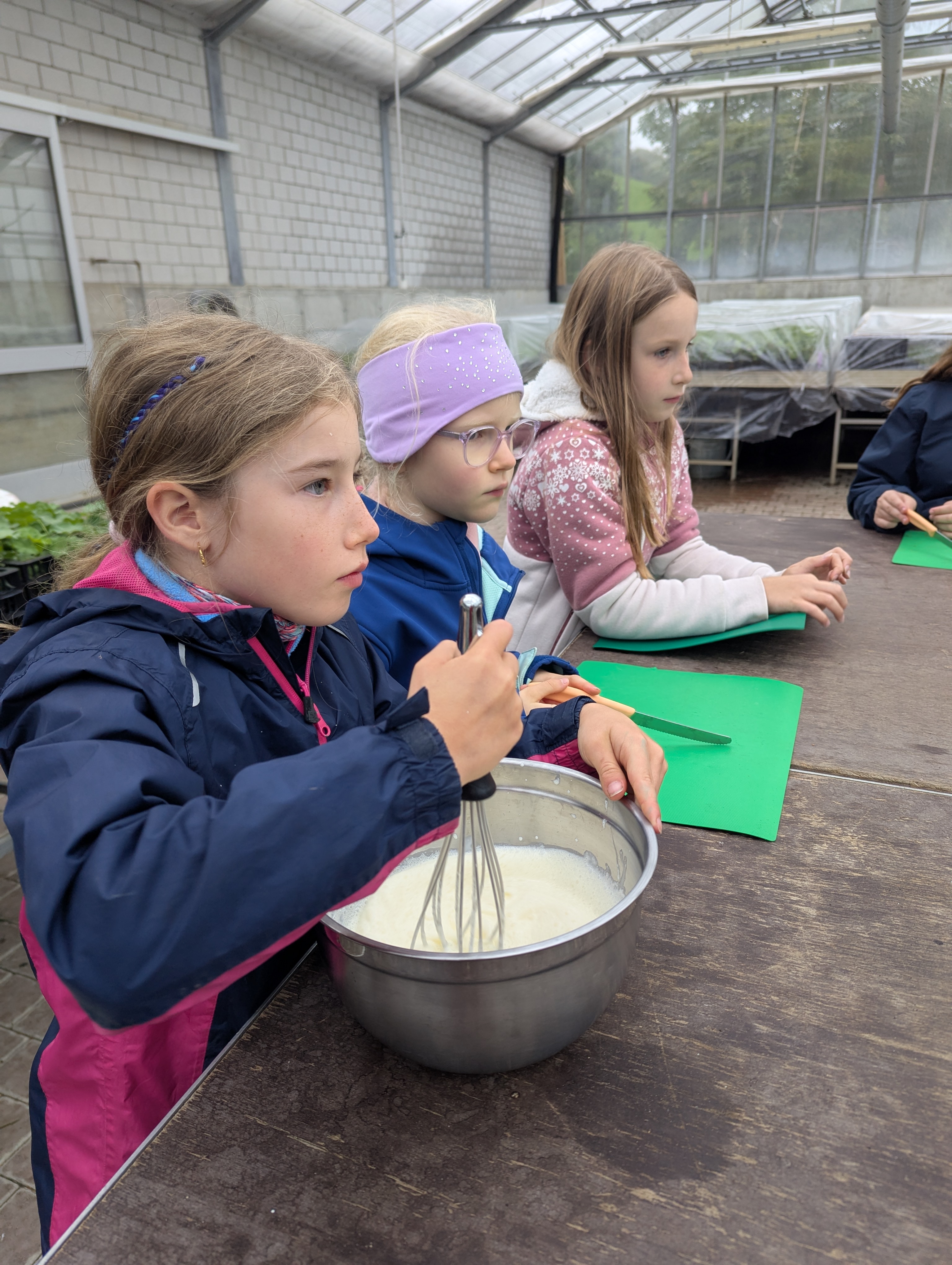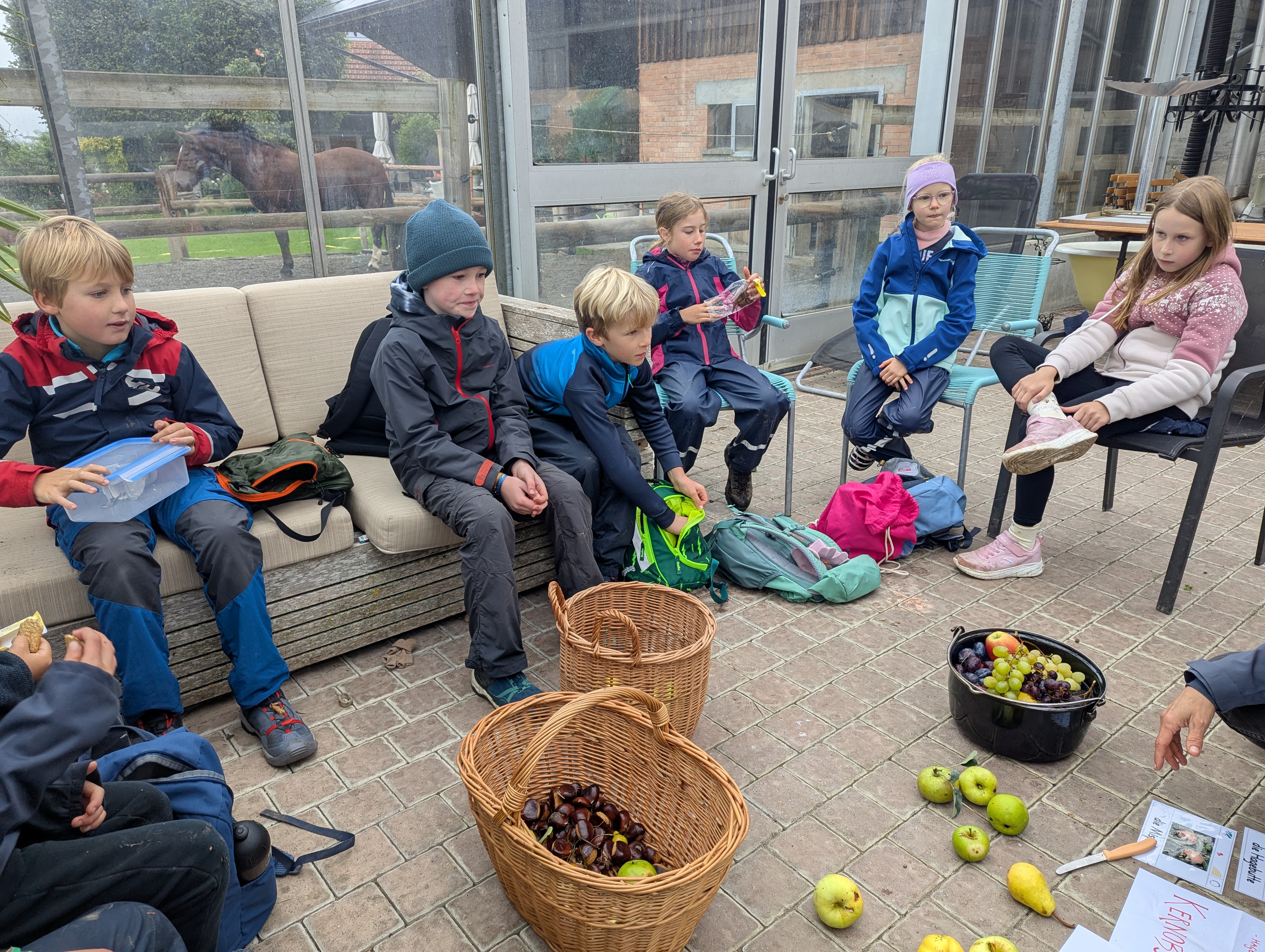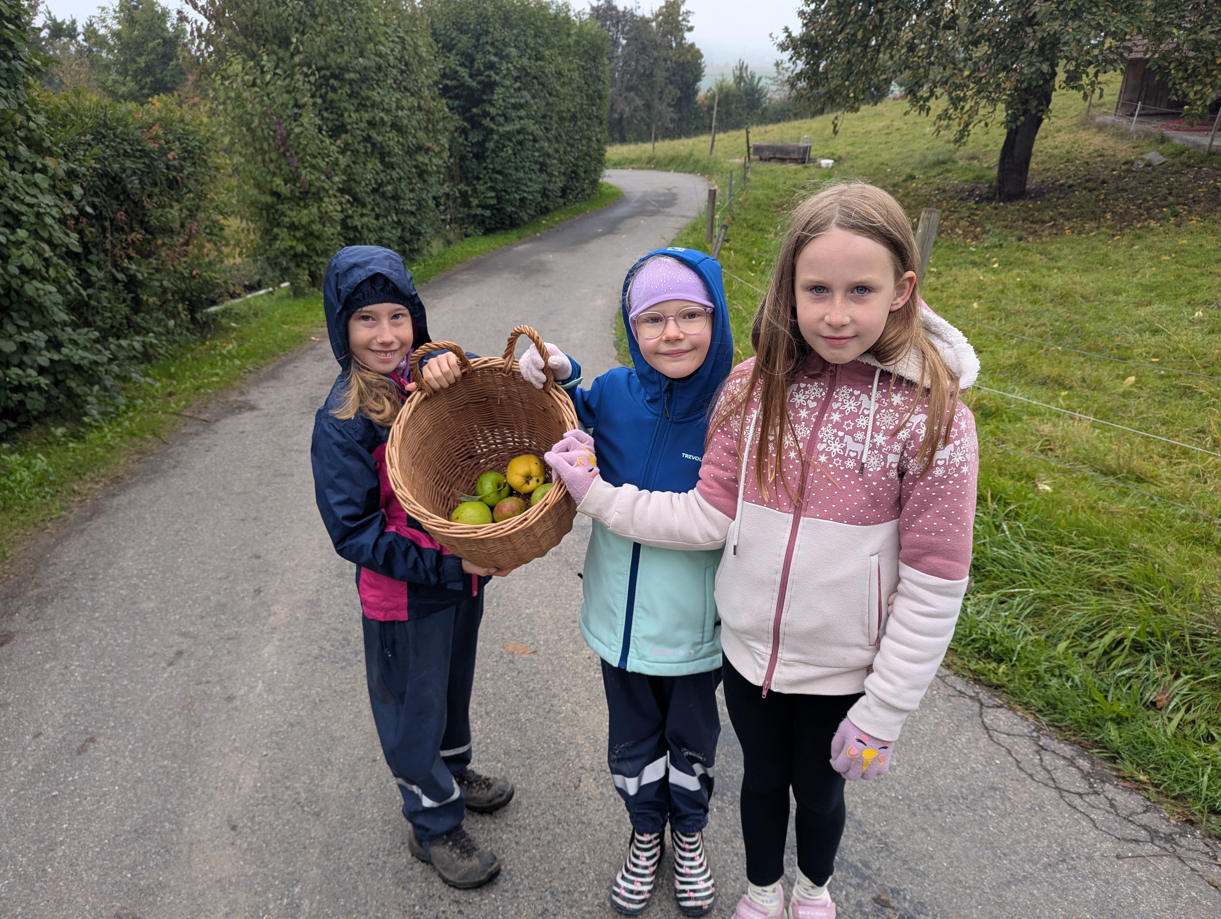 Wir waren in der Baumschule Reichenbach. Um 8.20 Uhr sind wir losgelaufen. Zuerst haben wir Früchte gesammelt und dann einen Fruchtsalat gemacht. Wir haben Schlagsahne geschlagen und die Früchte klein geschnitten. In der Zünipause konnten wir ins Gehege der Ziegen und durften das Pferd füttern. Um 11.20 Uhr haben wir uns wieder auf den Rückweg gemacht.
